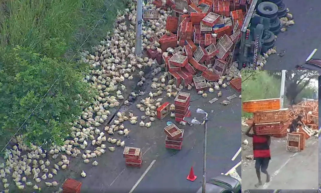 BRASIL – A manhã de hoje na Estrada do Gabinal, em Jacarepaguá, no Rio de Janeiro, foi de fartura para a população pobre da área. Um caminhão com centenas de galinhas tombou e o povo atacou a mercadoria, levando caixas e caixas cheias de penosas para casa.