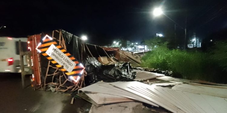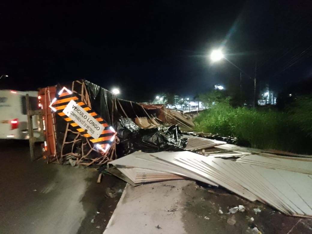 O Manaus (AM) – No sábado (16), uma carreta bitrem carregada com placas de MDF virou em um trecho da Avenida Buriti, em Manaus, perto da empresa Coplast. Não há feridos.