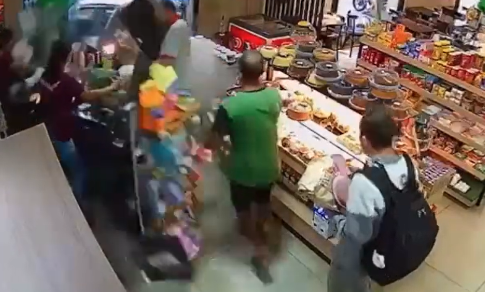 Câmeras do circuito interno de segurança mostram que por pouco os funcionários e os clientes não foram atingidos, inclusive uma criança e uma mulher.