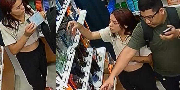 As imagens mostram a dupla fazendo de conta que vai comprar perfumes falando com a vendedora e cheirando os frascos, mas quando a vendedora se distrai eles vão colocando os perfumes na calço e na mochila.