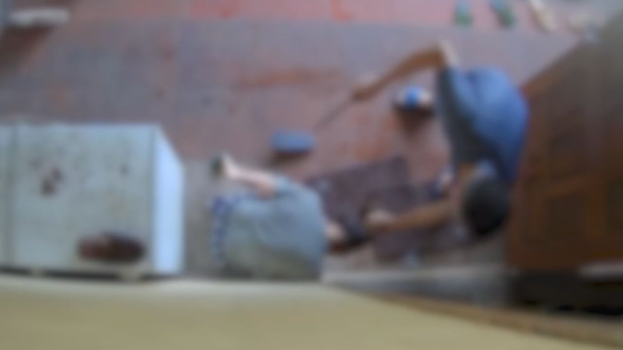 Ele usa uma faca e cutelo no crime e deixa a vítima ensanguentada principalmente por golpear o rosto dela. O homem ainda aparece arrastando o corpo dela para dentro da casa.
