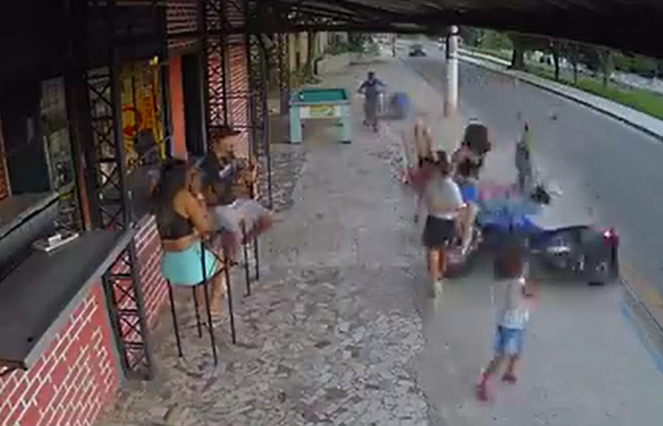 Uma câmera de um estabelecimento mostra que as vítimas, incluindo duas crianças, estavam na calçada quando a motocicleta vem atrás em alta velocidade, perde o controle e depois o condutor sai arrastando a via com ela.