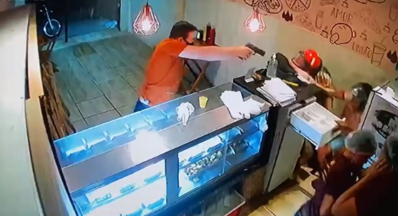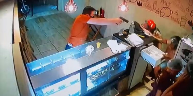 BRASIL – Um vídeo está entre os assuntos mais comentados desta terça-feira (5) nas redes sociais. Ele mostra um cliente reagindo a um assalto, sacando a arma e baleando dois bandidos.