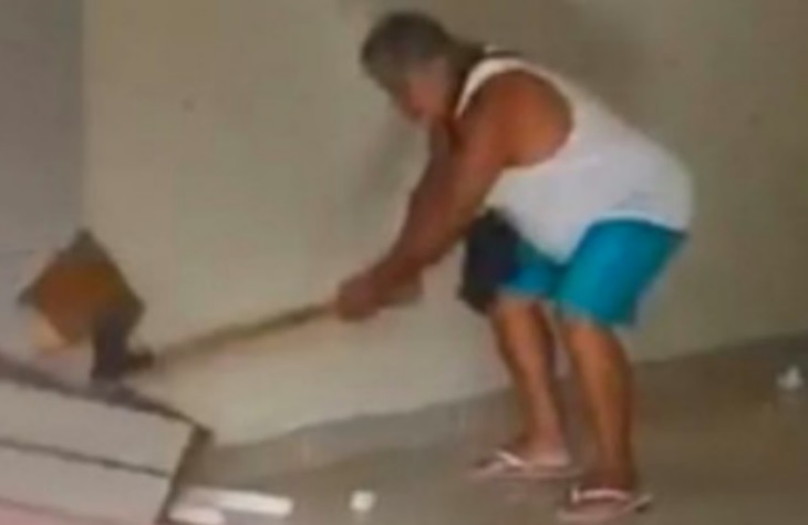 Ele ainda manda a loja processar e pede para que tudo seja filmado. Nem o guarda-roupa escapa das machadadas.