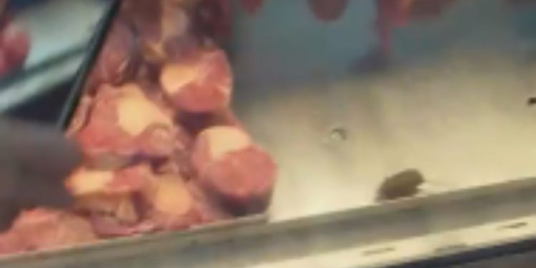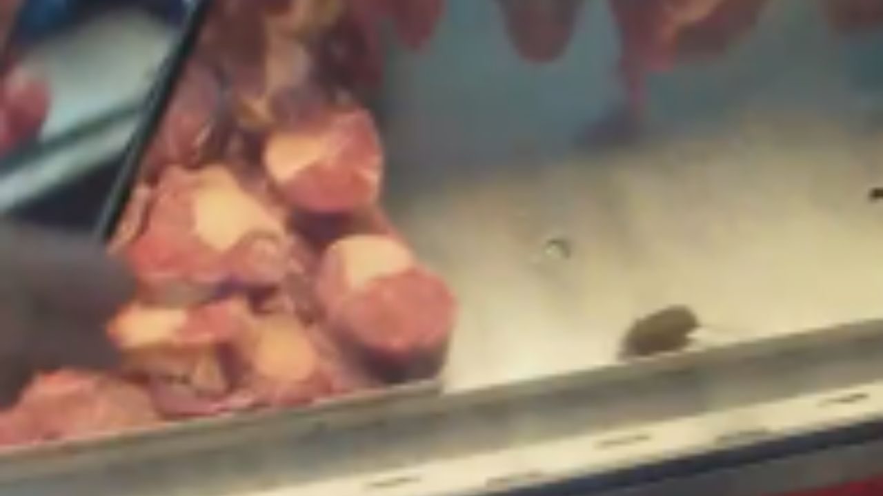 O roedor aparece andando pelas carnes enquanto os açougueiros tentam retirá-lo. Os clientes filmam tudo e chegam a indagar se eles vão jogar todas as carnes fora.