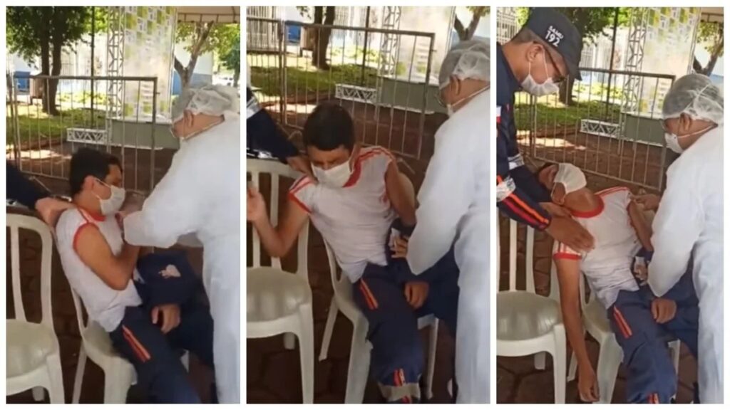 Rodrigo chegou a pedir a um colega que ajudasse a segurá-lo. “Segura eu aí, espera aí, espera aí… Ai, ai”, diz, nervoso. A enfermeira então aplica a vacina e ele perde a consciência. O socorrista contou que sempre faz brincadeiras com os colegas e, por isso, eles decidiram gravar o momento como uma forma de “dar o troco”.