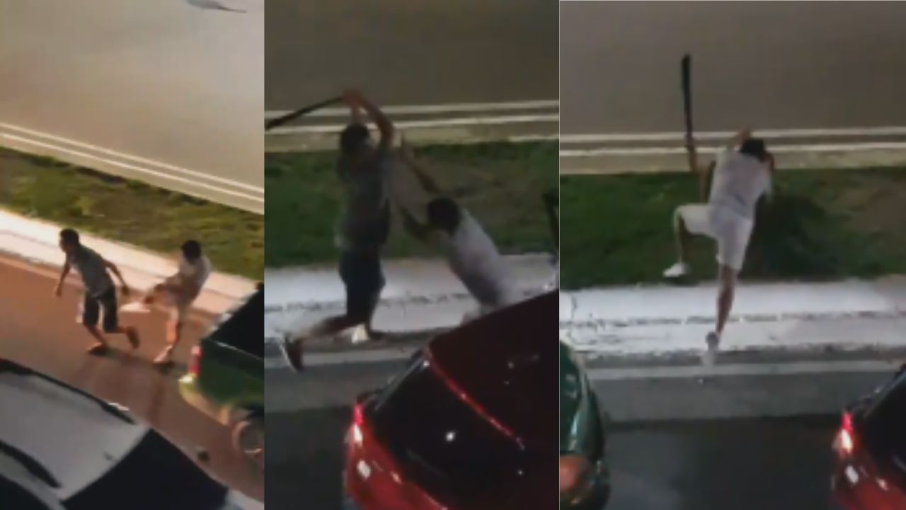 Conforme testemunhas, os dois motoristas haviam parado na avenida para discutirem quando começaram a trocar socos. Porém, um deles, que aparece de camisa cinza, volta para o seu veículo, pega um terçado e começa a golpear o da camisa branca.