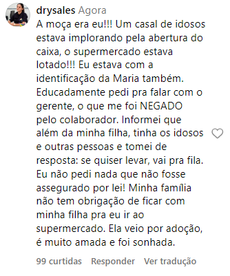 Nas redes sociais, logo o caso repercutiu e muitos saíram em defesa da mãe, falando que ela estava com razão e tinha direito. Adryanne respondeu uma postagem de um perfil e ressaltou ainda que fez a denúncia não só pela filha, mas porque o supermercado estava lotado e também tinha idosos.