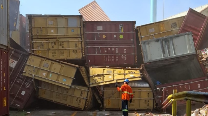 As primeiras imagens mostram o material empilhado um em cima do outro, sem relatos de feridos ou de prejuízos. “Container caiu aqui, só que a máquina está ali. Ainda bem que caiu lá pra trás, se cai pra frente, já ia para o saco”, diz o homem.