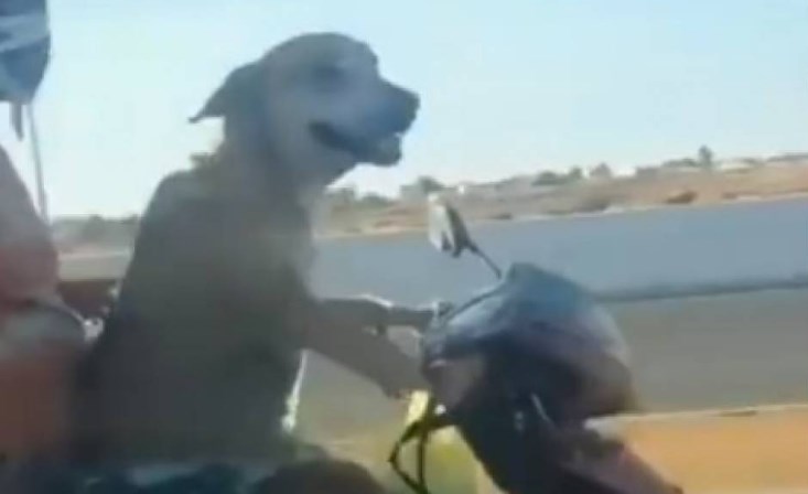 Nas imagens é possível ver um cachorro pilotando uma moto com dois homens na garupa.
