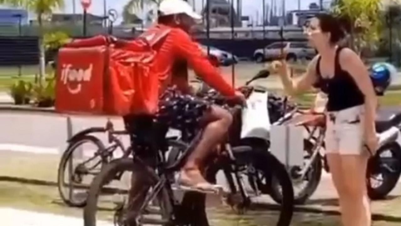 “Bora, seu vagabundo, me dá a p*rra da minha comida”, diz ela no vídeo que circula nas redes sociais logo após dizer que daria “voz de prisão” ao homem.