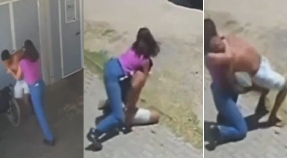 A policial entra em luta com ele, aplica um mata-leão e pega o suspeito na mão. Larissa Nogueira Freire ganhou os parabéns. O homem foi preso por desrespeitar medida protetiva contra a ex-mulher.