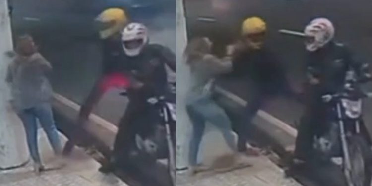 MANAUS – Uma mulher indefesa foi assaltada por dois bandidos em cima de uma moto na noite de domingo (5), no bairro Santo Agostinho, zona Oeste de Manaus. A câmera mostra o momento do crime e a tentativa da mulher de não entregar o aparelho.