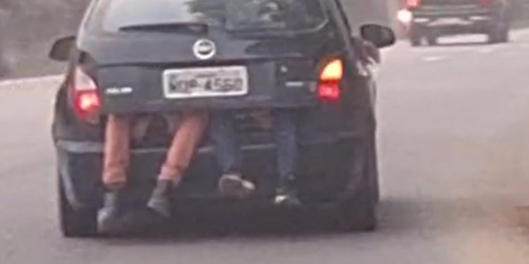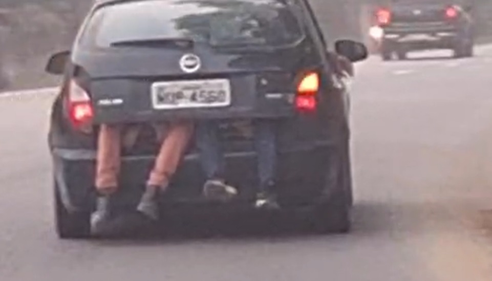 Dois sem noção com as pernas para fora no porta-malas de um carro, colocando as vidas em risco. Não foi especificado o horário da gravação, e nem se algum fiscal de trânsito viu a cena.