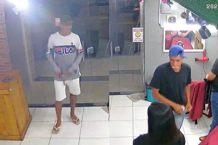 Conforme as imagens, a barbearia está com a porta trancada e logo uma moça abre para receber os assaltantes, achando que fossem clientes. O de branco está com uma arma na cintura.