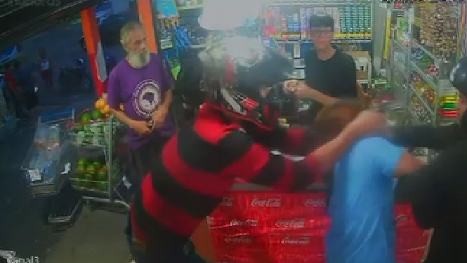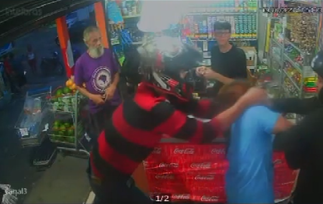De acordo com o proprietário do estabelecimento, os criminosos ameaçavam atirar em quem tentasse reagir. Uma cliente, que estava pagando suas compras no balcão, resistiu em entregar o celular e foi brutalmente agredida: jogada ao chão e pisoteada pelos ladrões, diante de todos que estavam no local – impotentes para ajudá-la.