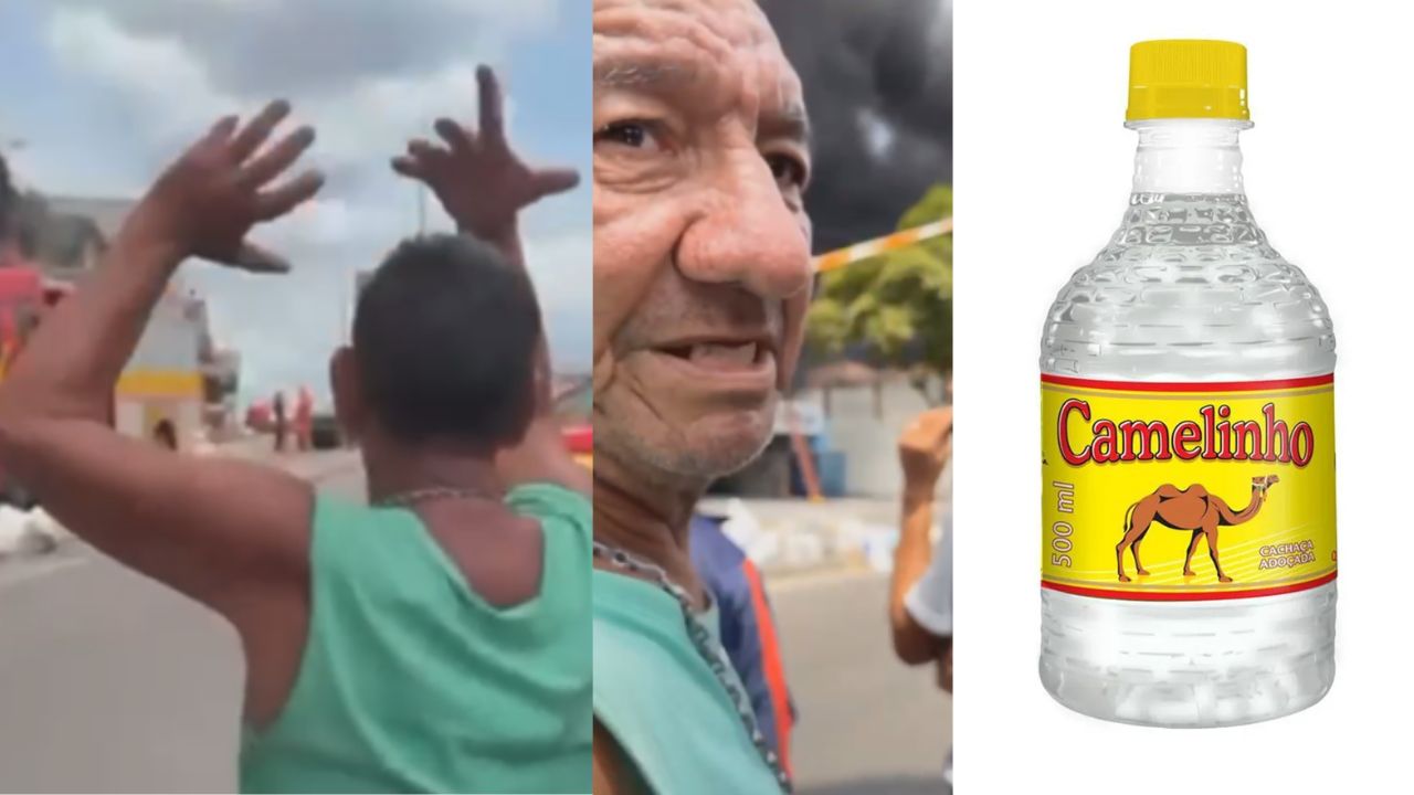 Nas imagens, um rapaz chega brincando com o cachaceiro: “Será que já queimou os Camelinho lá? Ele tá preocupado, não é com o fogo não, é com o Camelinho que vende ali”.