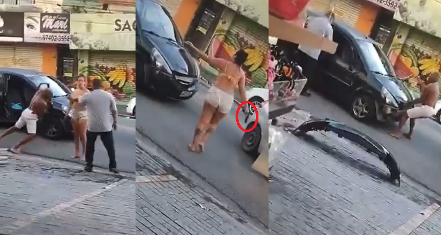 Depois, ele a danifica e também estraga o capô, além de arrancar o para-choque do veículo. Todos ficaram assistindo a cena abismados.