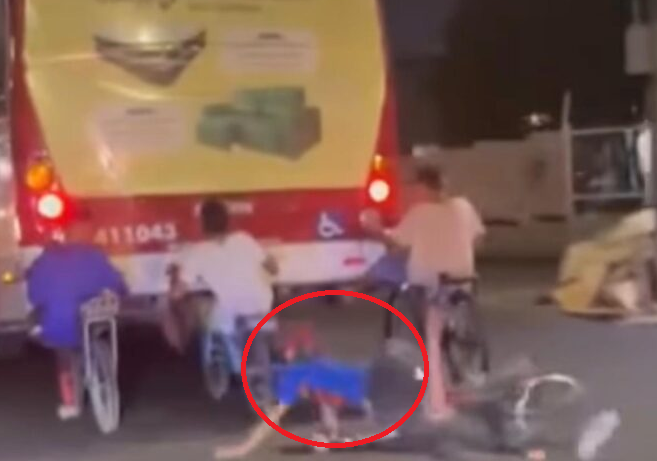 MANAUS (AM) – Adolescentes resolveram brincar de “pegar carona” com um ônibus em plena avenida Grande Circular, na Zona Leste de Manaus, e um deles acabou caindo de cabeça. Os quatro estavam com motocicletas.