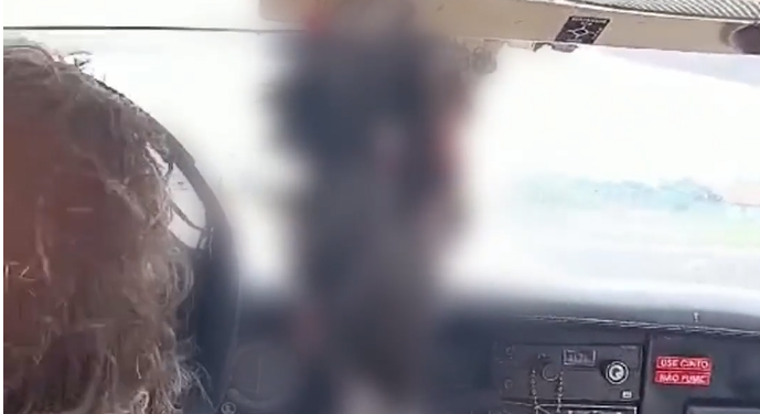 Um vídeo mostra o urubu com a cabeça pra baixo e sangrando. Por pouco ele não acabou atingindo a cabeça do piloto.