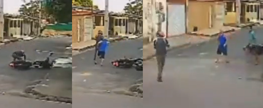 O crime ocorreu na tarde desta terça-feira (1º) e mostra o trabalhador passando pela via quando é abordado pelo assaltante numa moto. Ele é surpreendido pelo criminoso, que não estaria armado, e por isso reagiu. Os dois travam luta corporal e caem no chão.