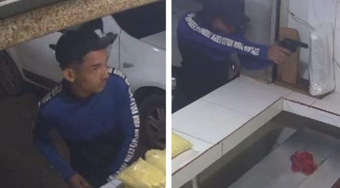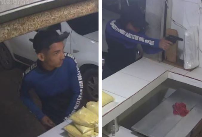 Após obter o pequeno valor disponível, o suspeito solicita um quilo de farinha, guarda a arma e aguarda a entrega da sacola, antes de fugir em seguida.