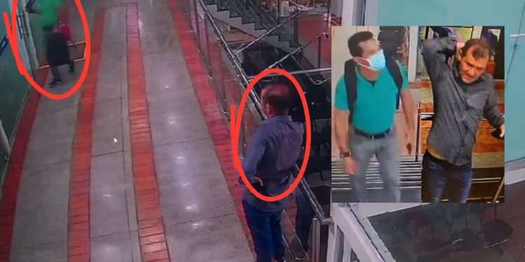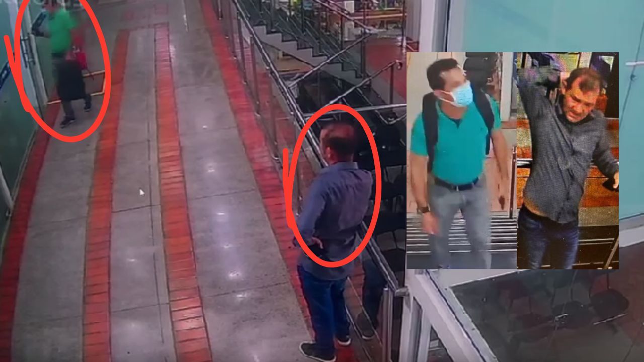 As imagens mostram claramente um homem vestindo uma camisa azul e calça jeans auxiliando outro indivíduo com camisa verde. No vídeo, é perceptível que ele chama seu comparsa assim que a sala fica desocupada.