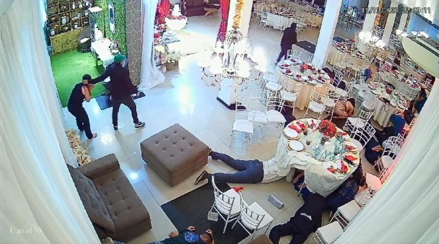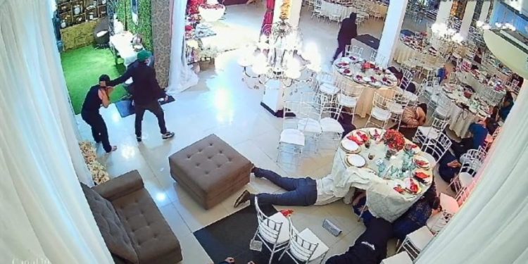 Câmeras do circuito interno do local gravaram a ação dos bandidos que pularam o muro. Eles agiam com muita violência e obrigaram os convidados a deitarem no chão ou ficarem debaixo das mesas. Um deles chega a puxar uma mulher pelos cabelos.