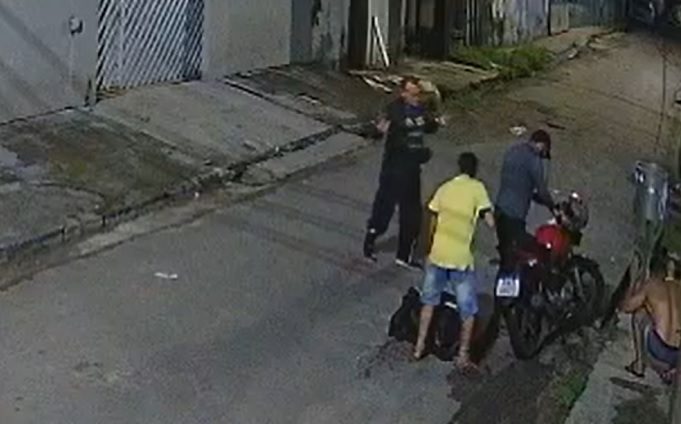 Câmeras de segurança mostram o momento em que homens abordar a vítima. Um deles, armado, rende o rapaz e ainda pega a bolsa de entrega.