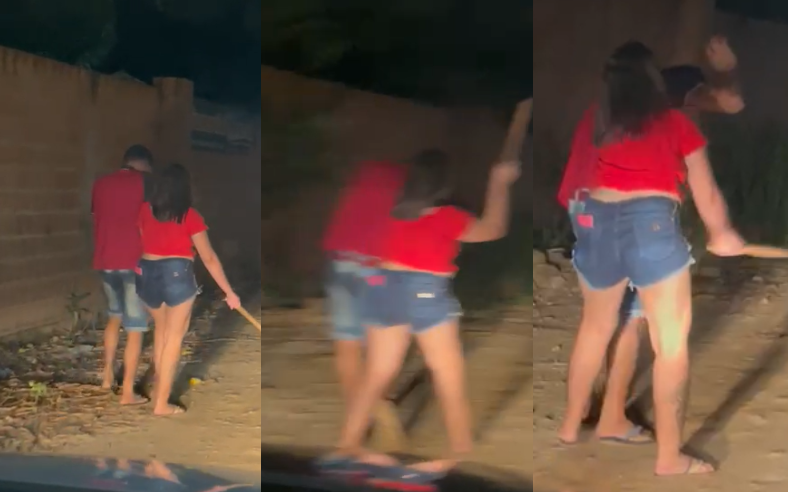 Revoltada, ela se armou com um pedaço de ripa e foi até o “point” do marido e o encontrou. Um vídeo que foi postado nas redes sociais mostra ela puxando pelo braço o homem e “tacando” a paulada nele no caminho de volta para casa.