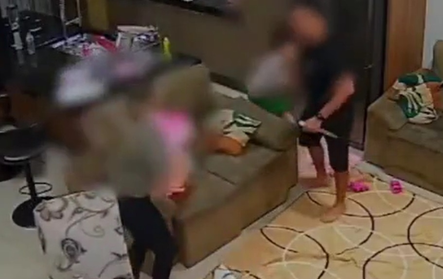 De acordo com a polícia, o caso ocorreu na noite do dia 4 de junho, e o suspeito está preso. A PM não informou a motivação da briga, mas é possível ver a mulher tentando escapar e a filha correndo risco de ser ferida, enquanto luta contra o pai.