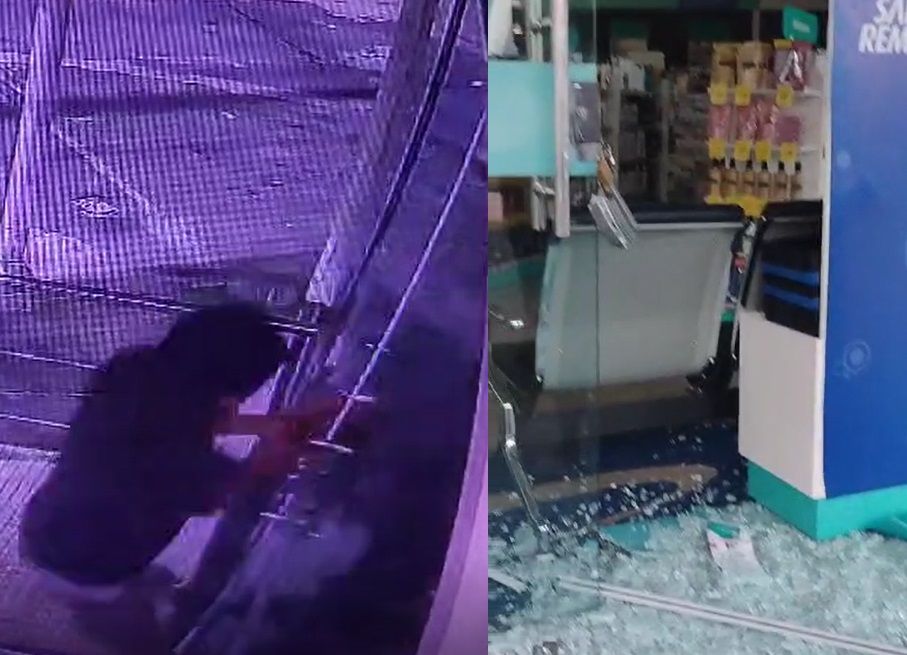 Nas imagens o homem surge fissurado para arrombar as portas da drogaria às 4h30 da manhã. Foram levadas fraldas, leite, desodorante e até chocolate.
