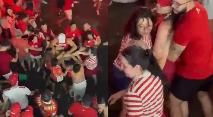 Nas imagens, é possível ver as duas se estranhando enquanto outras pessoas tentam apartar a briga. Só que a intervenção, em vez de acalmar, acabou piorando o tumulto ao redor. Formou-se uma grande aglomeração, com muitos gritos e empurra-empurra generalizado.