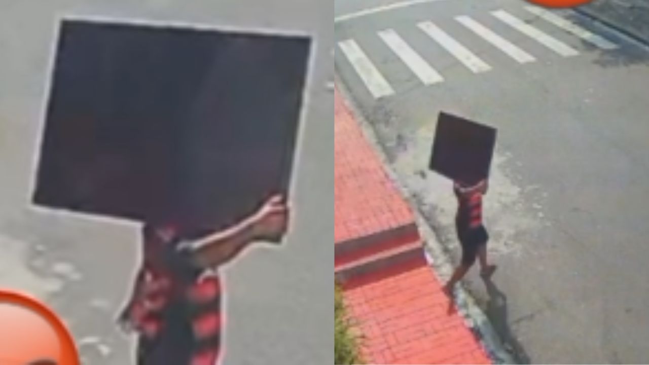 No vídeo da câmera, o criminoso aparece usando uma camisa do Flamengo com a TV no ombro.