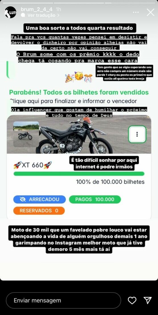 Nesta terças-feira (16), Gabriel apareceu na rede social rifando a moto, segundo ele, para bancar tratamento das feridas.
