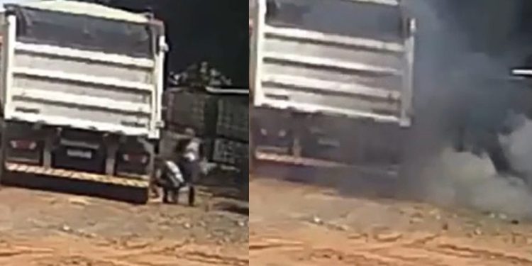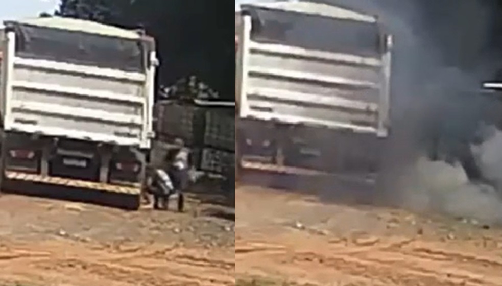 A imagem mostra o trabalhador realizando o reparto quando, do nada, o pneu explode. Os destroços do pneu atingiram Alcir Joelson mortalmente. O que matou ele foi um ferimento na cabeça.