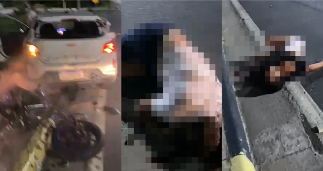 As imagens do homem e da mulher no asfalto são chocantes. O condutor estaria em alta velocidade quando atingiu um carro e foi arremessado.