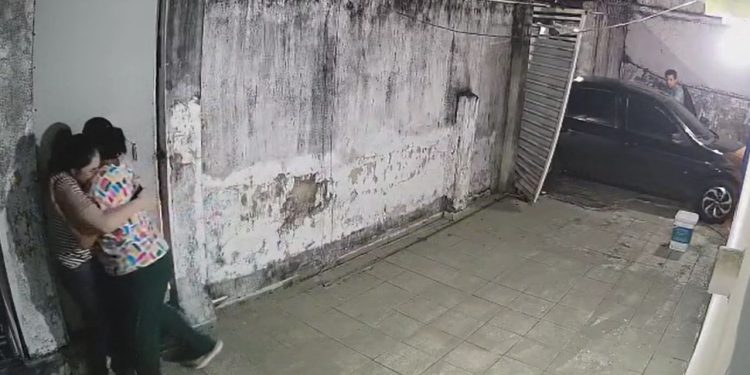 Mas o bandido se levantou e foi pra cima da família. Duas mulheres se abraçam. A filha do casal, que estava no banco de trás é quem aparece correndo nas imagens.