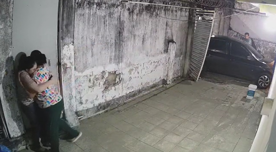 Mas o bandido se levantou e foi pra cima da família. Duas mulheres se abraçam. A filha do casal, que estava no banco de trás é quem aparece correndo nas imagens.