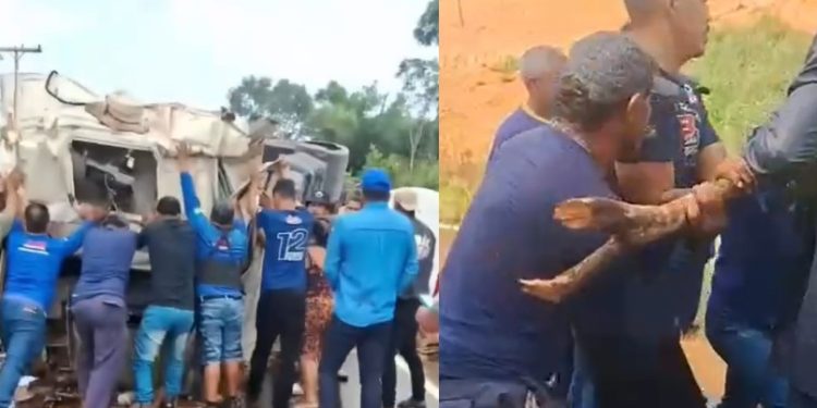 AMAZONAS – Um caminhoneiro preso nas ferragens foi retirado da cabine do caminhão no km 130 da rodovia AM-010. O vídeo do resgate nesta terça-feira (18), mostra o esforço da população para salvar a vida do motorista não identificado.