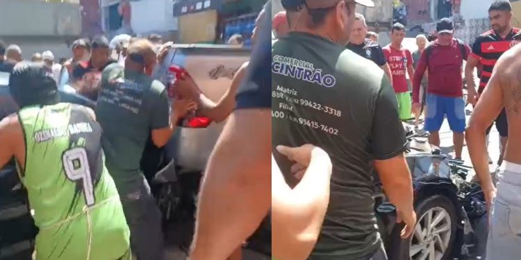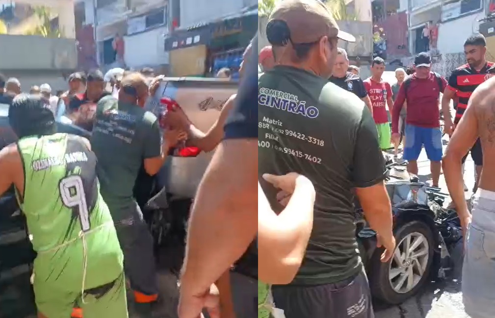 Um vídeo mostra as pessoas tentando retirar o carro de cima da idosa, na rua Olinto de Lima, esquina com a Paracatuba, no São José 1, zona leste de Manaus.