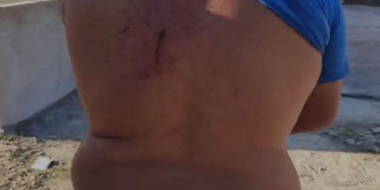O. P. B. de 47 anos, que terá o nome preservado por segurança, surge com o buraco aberto e sangrando. Ele foi socorrido após este vídeo, mas o estado de saúde dele é desconhecido.