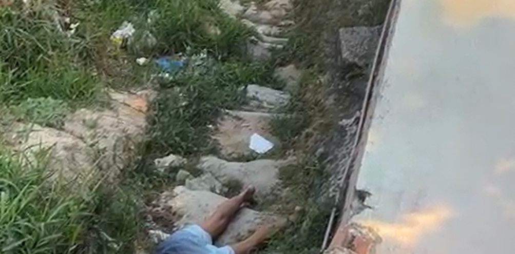 O calção e a blusa azul podem ajudar a identificar a vítima. IML e PM estão no local para fazer seus respectivos trabalhos.