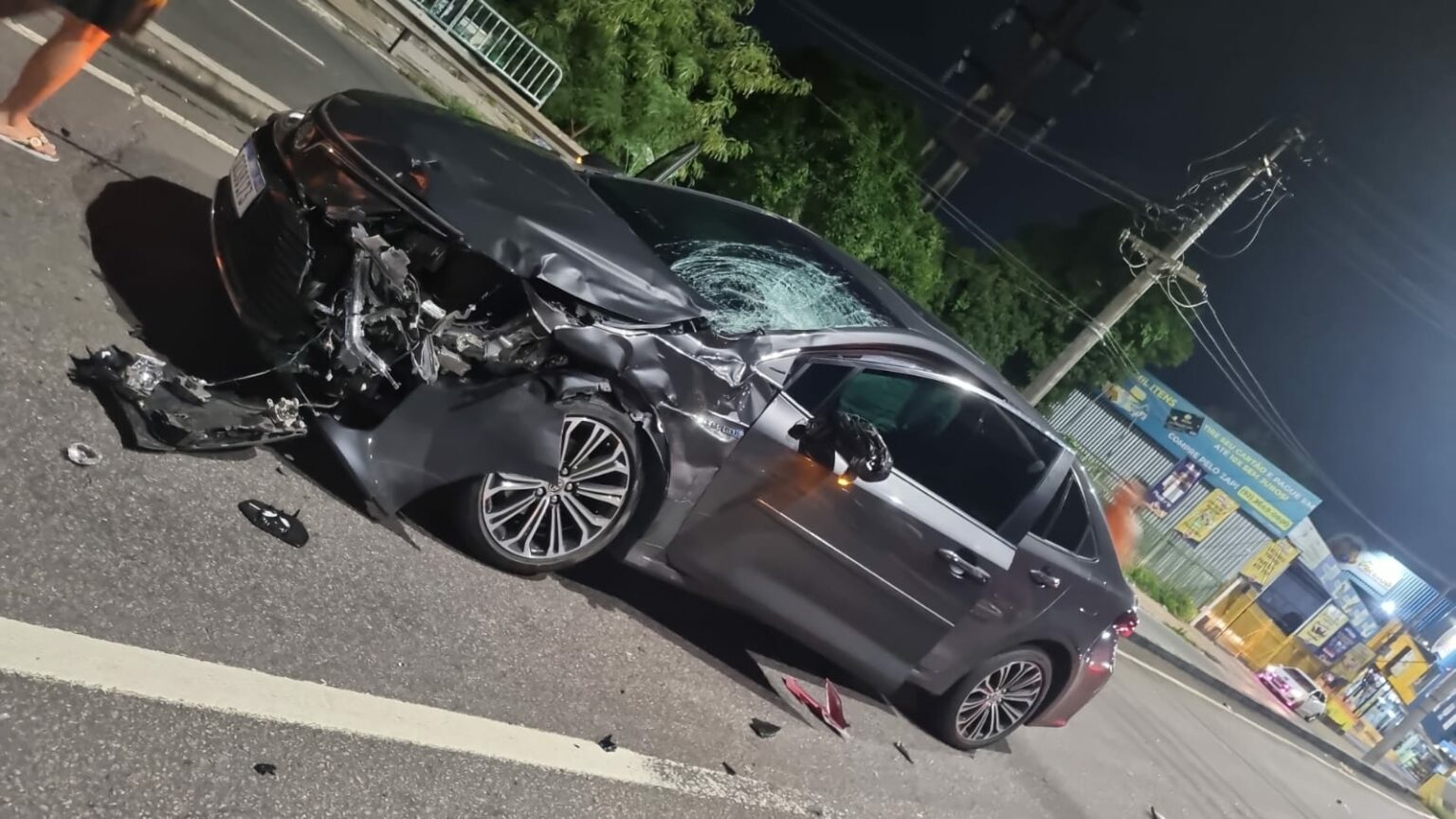 A frente do Corolla ficou totalmente destruída, indicando o local e a força do impacto da moto no veículo maior, que era conduzido por Douglas Soares Costa. Ele foi levado para prestar depoimentos.