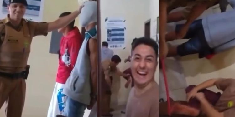 Nas imagens um jovem leva um tapa enquanto está com uma luva cirúrgica. Depois, o outro PM entra, dá risada, e segura o pé do outro agredido para que ele apanhe com cabo de vassoura.