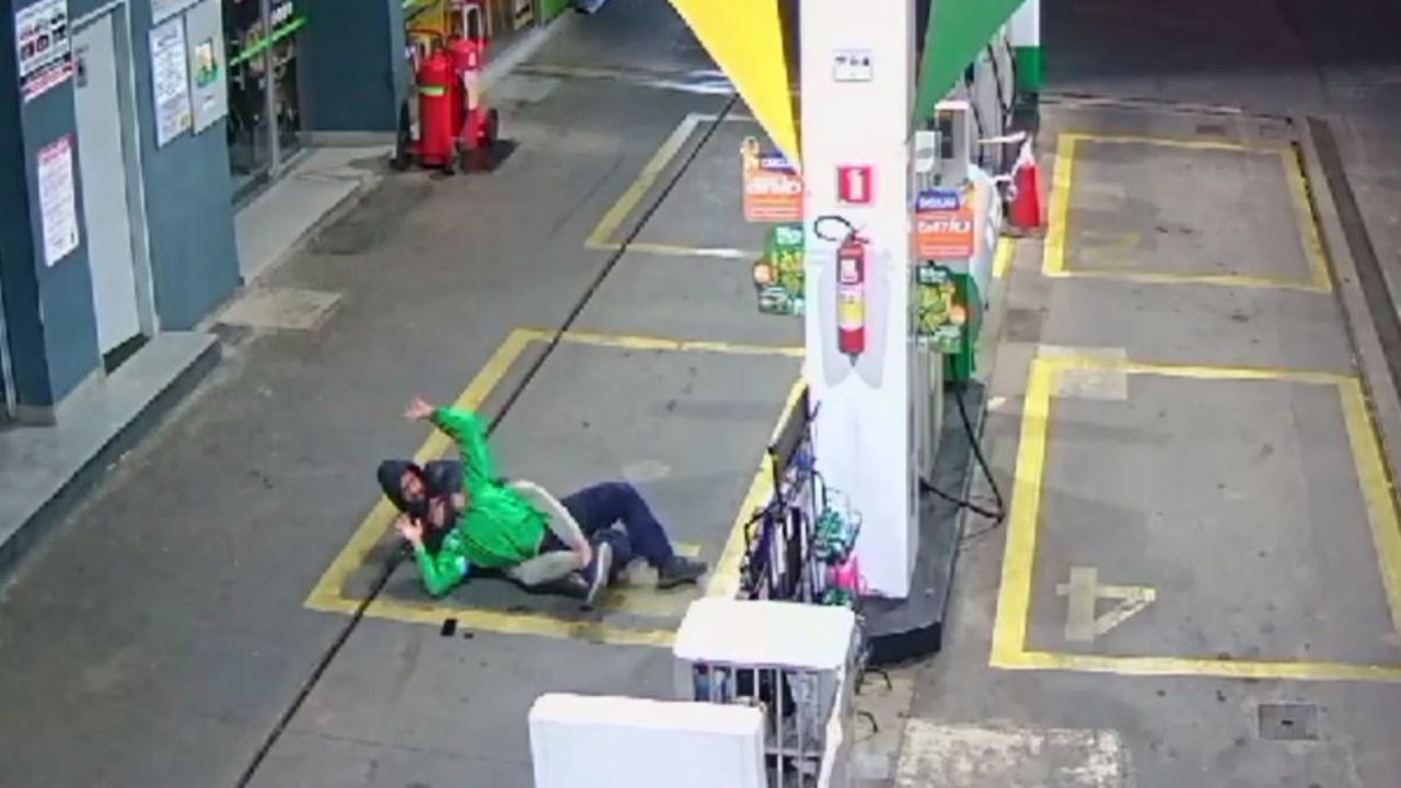 O criminoso chega de capuz e anuncia o assalto. O frentista reage e ambos caem no chão, e permanecem por alguns segundos. Nesse momento, o trabalhador é imobilizado com o golpe conhecido como ‘mata-leão’.