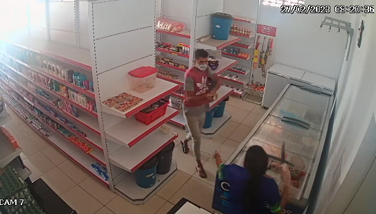 As câmeras de segurança registraram o flagrante. Nas imagens, o assaltante, usando máscara, se aproxima do balcão e anuncia o assalto, ele portava um revólver calibre 22 e a ameaçou, mas ele não contava que a mulher reagiria com um facão.