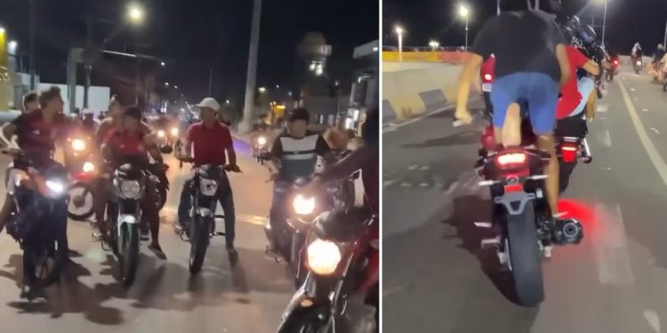 MANAUS – Um rolezinho em Manaus acabou com um motoqueiro e uma mulher cercados na garupa da moto. A cena impactante ocorreu na noite desta quinta-feira (9).