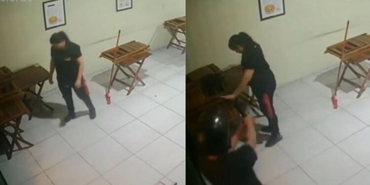 Com a arma em punho, ele aponta para os clientes, não rouba em nada e vai em direção à vítima, que arrumava uma mesa.