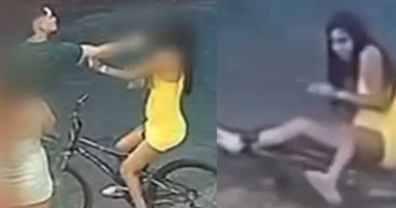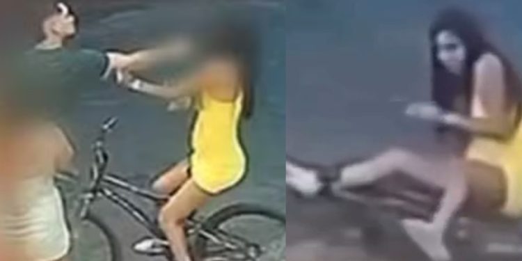 A jovem aparece primeiro sendo agredida com tapas, por motivo ainda não informado, até que joga água nele, momento em que o homem saca a arma de dá os tiros.